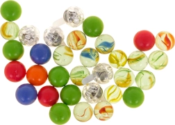 Enthalten sind 33 Kugeln, davon 5 blinkende mit farbigen LEDs. Lichteffekte animieren zum Ausprobieren neuer Strecken und verlängern die Spielzeit.