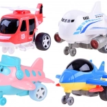 Im Set enthalten sind drei farbenfrohe Flugzeuge und ein Hubschrauber mit Rädern – bereit für sofortiges Spielen und Transportieren.
