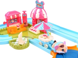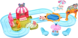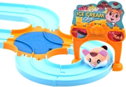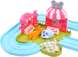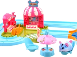 Dieses interaktive Set kombiniert eine Eisdiele mit einer farbenfrohen Bahn, auf der sich der Hamster selbstständig bewegt und dank der Weiche die Richtung ändert. Kinder können ihre Figuren einbeziehen, sie in die Stühlchen setzen und Café-Bedienung spielen. Der Hamster kann den beiliegenden Wagen ziehen und Desserts auf einer ebenen, glatten Oberfläche ausliefern.