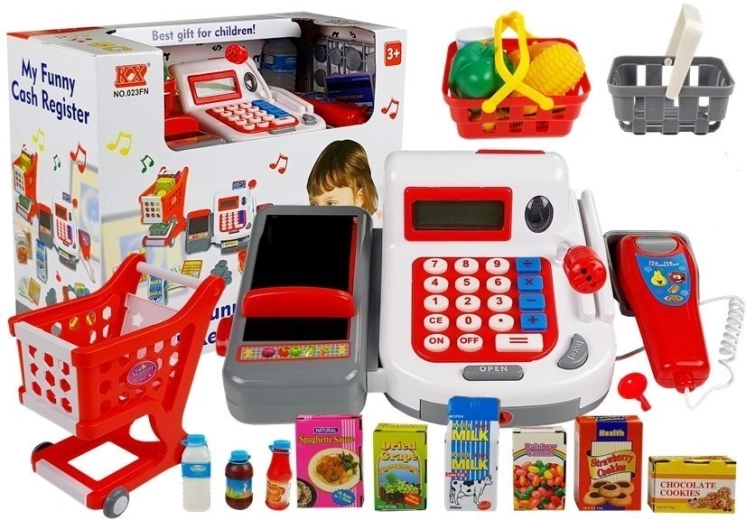 Das Set enthält eine Reihe von Zubehör, das für jeden Verkäufer unverzichtbar ist. Ein geräumiger Einkaufswagen und zwei kleinere Körbchen ermöglichen es, in Ruhe Produkte auszuwählen. Nach dem Einkauf können wir mit Banknoten und Münzen zahlen, die im Set enthalten sind. In unserem Laden können wir auch mit Karte bezahlen, und die Waren zum Abkassieren legen wir auf das an der Kasse befestigte Band, das wir mit einem Schieber bewegen. Ein Mikrofon und das Display lassen uns uns bis zum Schluss wie eine echte Kassiererin bzw. ein echter Kassierer fühlen.