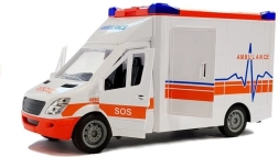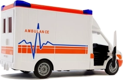 Ein detailgetreu nachgebildeter Krankenwagen. Das Fahrzeug ist bis ins kleinste Detail ausgearbeitet, der Innenraum ist mit allen Elementen eines echten Fahrzeugs ausgestattet, wie Lenkrad, Armaturenbrett, Sitze. Das Fahrzeug verfügt über Sound- und Lichteffekte, die über die auf dem Fahrzeugdach angebrachten Tasten aktiviert werden. Das Fahrzeug hat einen Rückzugantrieb. Seitliche und hintere Türen lassen sich öffnen und das Dach ist abnehmbar. Außerdem sind klappbare und abnehmbare Rettungstragen im Set enthalten. Das Auto ist leicht und schön verarbeitet, wird mit Batterien betrieben, die im Set enthalten sind. Das Fahrzeug hat Gummiräder. Ein großartiger Krankenwagen für den Transport von Patienten oder andere Aufgaben bei Rettungseinsätzen.