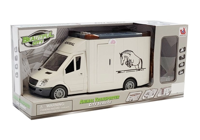 Ein detailgetreu nachgebildetes Fahrzeug zum Transport von Pferden. Das Fahrzeug ist bis ins Detail ausgearbeitet, der Innenraum ist mit allen Elementen eines echten Fahrzeugs ausgestattet, wie Lenkrad, Armaturenbrett und Sitzen. Das Fahrzeug verfügt über Sound- und Lichteffekte, die über Tasten auf dem Dach aktiviert werden. Es besitzt einen Reibungsantrieb. Seitliche und hintere Türen lassen sich öffnen, zudem ist das Dach abnehmbar. Im Set ist zusätzlich eine Pferdefigur enthalten. Das Auto ist leicht und schön verarbeitet, wird mit Batterien betrieben, die dem Set beiliegen. Das Fahrzeug hat Gummireifen.