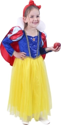 Ein blaues Oberteil mit goldenen Verzierungen, ein gelber Rock und ikonische rote Akzente vermitteln den Eindruck von Schneewittchen. Perfekt für Karneval und Spielen zu Hause.
