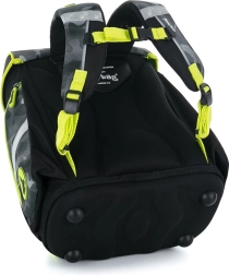 Der Rucksack bietet ein stilvolles schwarzes und graues Tarnmuster mit gelben Akzenten, was ihn nicht nur funktional, sondern auch optisch ansprechend macht.