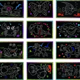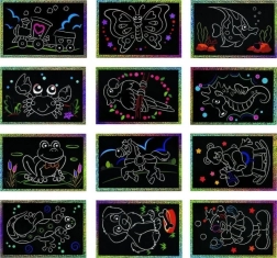 Dieses Set mit Rubbildern ist die ideale Wahl für die ersten Bastelversuche. Das einfache Prinzip, das gesamte Motiv ohne komplizierte Details freizulegen, ist für Kinder leicht verständlich und liefert sofort sichtbare Ergebnisse: wunderschöne glitzernde und bunte Bilder, die effektvoll glänzen.