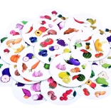 Fesselnde Bilder von Karotten, Erbsen, Zitronen oder Trauben halten die Aufmerksamkeit und fördern das Erkennen von Formen und Farben.