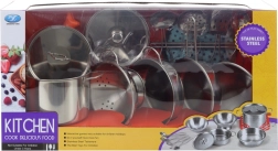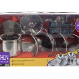 Das Edelstahl-Kochgeschirrset enthält einen Topf, ein Sieb, eine Pfanne, eine Schüssel, einen flachen Topf, 2 Deckel, eine Suppenkelle, einen Pfannenwender, ein kleines Handsieb und eine Pastakelle. Verpackt in einer Schachtel. Verpackungsmaße ca. 38×20×10 cm. Alter 3+