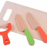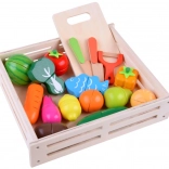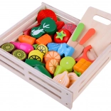 Verpackungsinhalt: Holzkiste, Schneidebrett, beidseitiges Messer, Schäler, verschiedene Obst- und Gemüsesorten wie Tomate, Karotte, Gurke, Paprika, Erdbeeren, Kiwi und mehr.