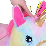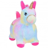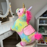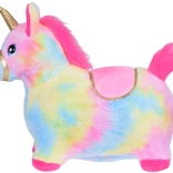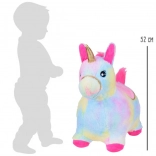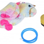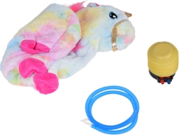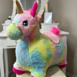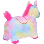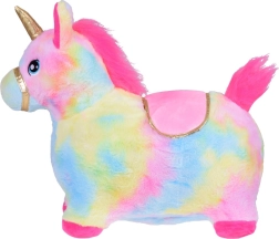Dieses Hüpf-Einhorn vereint einen robusten aufblasbaren Gummikörper mit einem weichen, angenehmen Plüschbezug in Regenbogenfarben. Sorgfältig gearbeitete Details wie gestickte Augen, goldenes Zaumzeug, ein weicher Stoffsattel mit goldener Paspel sowie eine rosa Mähne mit Schweif werden Kinder begeistern. Zwischen den Ohren ist eine Pfeife versteckt, die jedes Hüpfen zusätzlich aufpeppt.