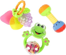 Dieses farbenfrohe 3er-Set umfasst eine Frosch-Rassel, eine Hantel mit rasselnden Elementen und einen Beißring in Obstform. Die Spielzeuge sind leicht, sicher und so gestaltet, dass sie vom Baby einfach gegriffen werden können. Die erzeugten Geräusche und kontrastreichen Farben wecken Neugier und fördern die Sinnesentwicklung.