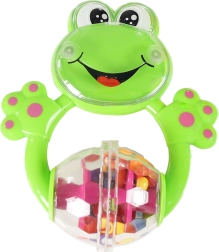 Leichte Rassel mit fröhlichem Frosch und Kügelchen im transparenten Mittelteil fördert Gehör und Hand-Auge-Koordination.