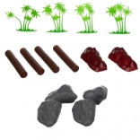 Enthalten sind 14 Elemente (Steine, Felsen, Palmen, Baumstämme), mit denen Kinder Bauernhof-, Safari- und Waldwelten gestalten und ihre Fantasie sowie das Erzählen fördern.