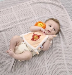 Die geknoteten Ecken und weichen Etiketten unterstützen das taktile Entdecken und die Feinmotorik. Das Baby ist beschäftigt und trainiert ganz natürlich den Griff.