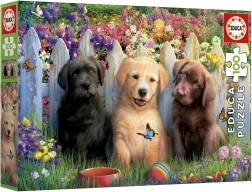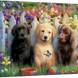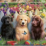 Drei verspielte Welpen in einem bunten Garten mit Blumen und Schmetterlingen ziehen die Aufmerksamkeit auf sich und motivieren zum Puzzeln.