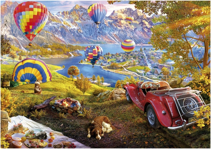 Die Landschaft mit See, Bergen und bunten Ballons, ergänzt durch ein rotes Cabrio und ein Picknick, bietet zahlreiche Details, die das Puzzeln angenehmer und schneller machen.