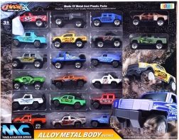 Das große Set mit 20 Metallautos begeistert kleine Sammler und Rennfans. Die Modelle haben eine Metallkarosserie auf einem Kunststofffahrgestell, umfassen Geländewagen und Pick-ups mit detailreicher Verarbeitung und auffälliger Grafik. Jedes Modell ist etwa 7,5–8 cm lang.