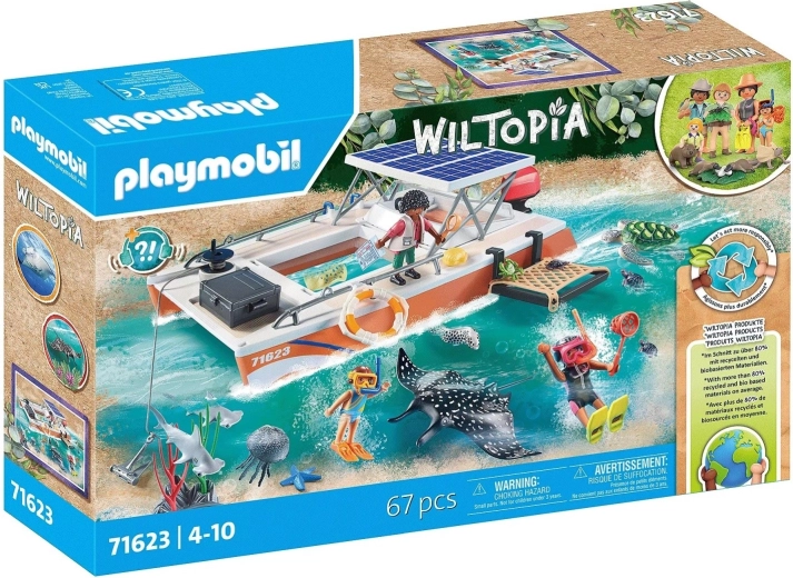 Entdecken Sie die Schönheiten des Great Barrier Reefs mit dem Katamaran mit Glasboden und Solardach von PLAYMOBIL WILTOPIA. Das Set bietet ein nachhaltiges Design, einen Glasboden mit Lupenfunktion zur Beobachtung des Lebens unter der Wasseroberfläche, ein Solardach und eine umfangreiche Sammlung von Meerestieren, darunter Hammerhaie, Rochen, eine Qualle und eine Familie von Meeresschildkröten. Tauch- und Forscherausrüstung für stundenlanges Entdecken und Spielen ist ebenfalls enthalten.
