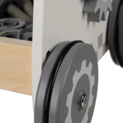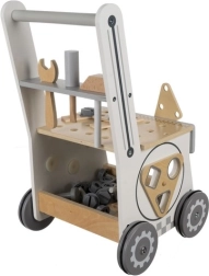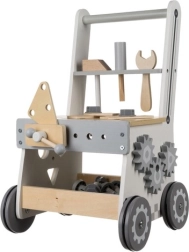 Ein Produkt, drei Einsatzmöglichkeiten. Kinder können schrauben, den Wagen bei den ersten Schritten schieben und Werkzeuge sowie Teile in übersichtlichen Fächern verstauen.