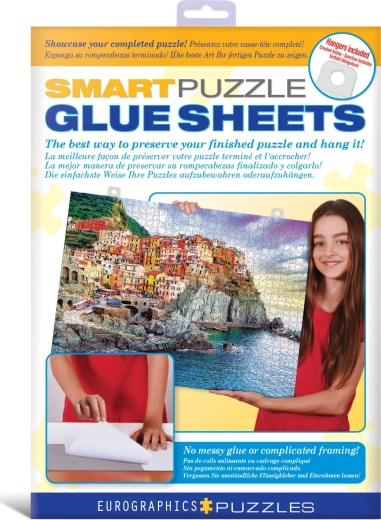 Möchten Sie Ihr Lieblingspuzzle ausstellen? Das EUROGRAPHICS Smart Puzzle Glue Sheets Set bietet eine einfache und saubere Lösung. Die selbstklebenden Folien halten die Teile fest zusammen und zwei Haken ermöglichen ein bequemes Aufhängen an der Wand.