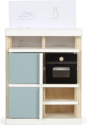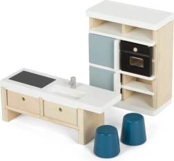 Dieses schön gestaltete Küchen-Set für das Puppenhaus bietet ein realistisches Spielerlebnis. Es besteht aus einem hohen Küchenschrank, einer Insel mit Spüle und Kochfeld sowie einem Esstisch mit zwei Bänken und Hockern. Der Küchenschrank verfügt über eine kombinierte Kühl- und Gefrierkombination sowie einen Ofen mit beweglichen Türen.
