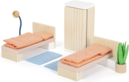 Das Miniatur-Schlafzimmer für das Puppenhaus der Marke Small Foot bringt den Charme echter Möbel in die Welt der Kinder. Dieses elegante Möbelset umfasst ein Doppelbett, das leicht in zwei separate Betten geteilt werden kann, was Flexibilität für verschiedene Spielmöglichkeiten bietet. Dazu gehören auch zwei Kissen, zwei Bettdecken, ein Kleiderschrank mit Spiegel, eine Lampe und zwei Teppiche, die die Authentizität dieses Miniatur-Schlafzimmers vervollständigen.