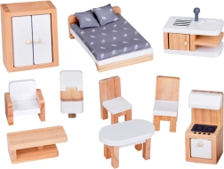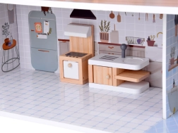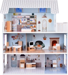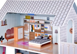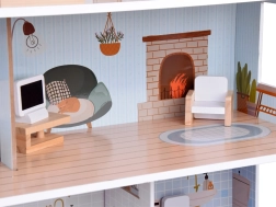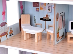 Im Lieferumfang enthalten ist ein umfangreiches Möbelset, mit dem sich die einzelnen Räume leicht einrichten lassen. Die Konstruktion aus robustem Holz, glatte Kanten und ungiftige Materialien gewährleisten sicheres Spielen. Die Montage ist schnell und intuitiv – die Teile sind nummeriert und eine bebilderte Anleitung führt Schritt für Schritt.