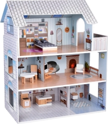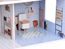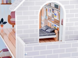 Diese stilvolle Holzvilla für Puppen bietet drei Etagen voller Spaß und viel Raum für Fantasie. Kinder entdecken eine Küche, ein Badezimmer, ein Wohnzimmer, ein Esszimmer und ein geräumiges Schlafzimmer mit Balkon. Realistische Tapeten, Bodenbeläge und kleine Dekorationen in Pastellfarben schaffen eine gemütliche Atmosphäre für unendliche Geschichten.