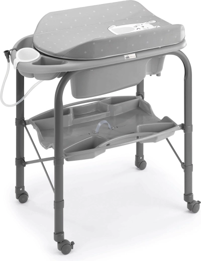 Wickeltisch Cambio ist die ideale Wahl für Eltern, die eine praktische und innovative Lösung für die Babypflege suchen – auch in kleineren Badezimmern. Dank des ultrakompakten Klappsystems lässt er sich leicht zusammenklappen und nimmt wenig Platz ein. Cambio ist für Kinder von der Geburt bis 12 Monate geeignet und mit einer weichen Wickelauflage für maximalen Komfort ausgestattet. Im Lieferumfang enthalten ist die Babywanne Baby Bagno, die mit zwei anatomischen, rutschfesten Einsätzen konzipiert ist – für die Kleinsten von 0 bis 6 Monaten mit integrierter Liegefläche, während für Kinder von 6 bis 12 Monaten die andere Seite mit Sitz und Armlehnen vorgesehen ist. Für noch mehr Komfort verfügt der Tisch über einen praktischen Ablaufschlauch zum Entleeren des Wassers sowie Aufbewahrungsmöglichkeiten für Seife, Waschlappen und weitere Utensilien.