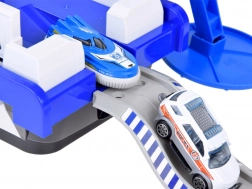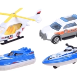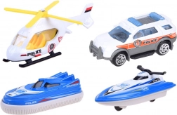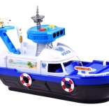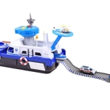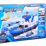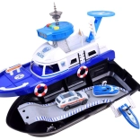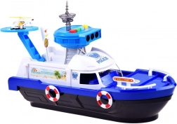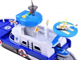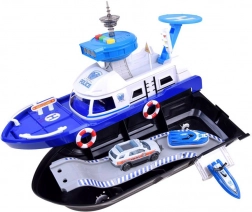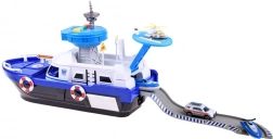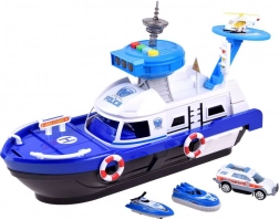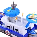 Dieses detailreich gestaltete Polizeiboot in Weiß-Blau ist bereit für jede Mission – auf dem Wasser, an Land und in der Luft. An Bord finden sich ein Helipad mit Hubschrauber, ein Kontrollturm mit Licht- und Soundeffekten sowie ein Innenstauraum für den Transport von Fahrzeugen. Das öffnende Cockpit mit Steuerruder und einer Kapitänsfigur verstärkt den Realismus.