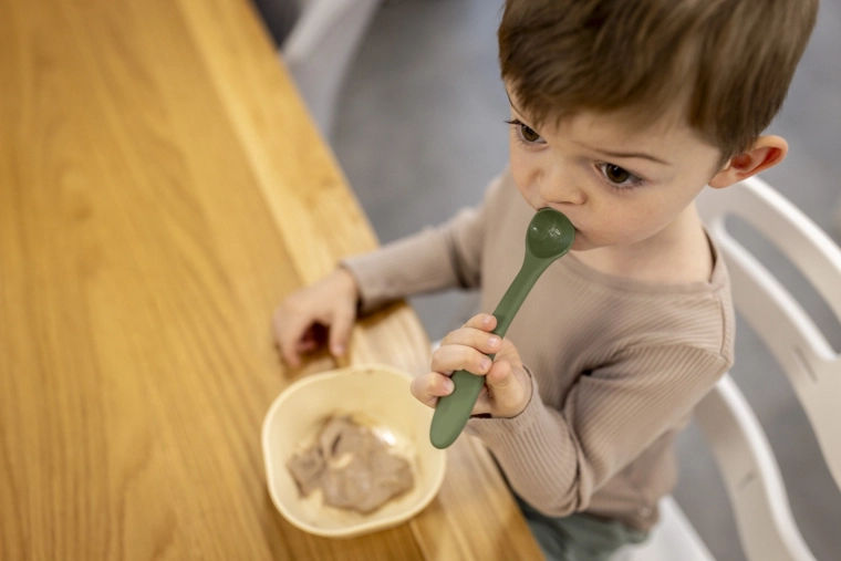 Der ergonomisch geformte Löffel erleichtert das Füttern sowohl für Eltern als auch für Kinder bei den ersten eigenständigen Essversuchen.
