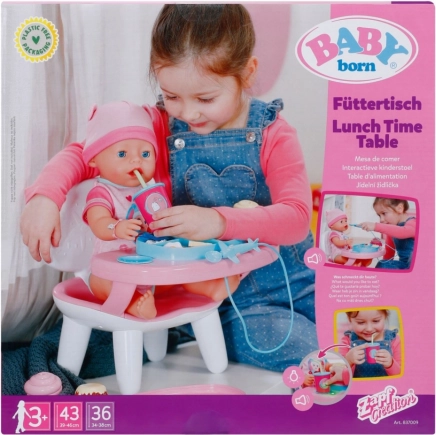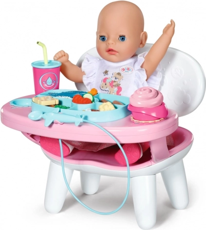 Inszeniere das Lieblingsfüttern mit der BABY born Puppe! Dieser interaktive Hochstuhl bietet Licht- und Soundeffekte, die Kindern zeigen, ob der Puppe das „Essen schmeckt“. Dank grünem und rotem Lichtsensor sowie dem lustigen Löffel mit Flugzeuggeräusch kommt die Fantasie voll auf ihre Kosten. Inklusive reichhaltigem Zubehör für Rollenspiele und Snackbox für Reste.