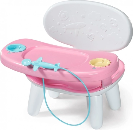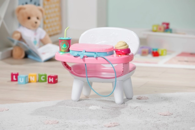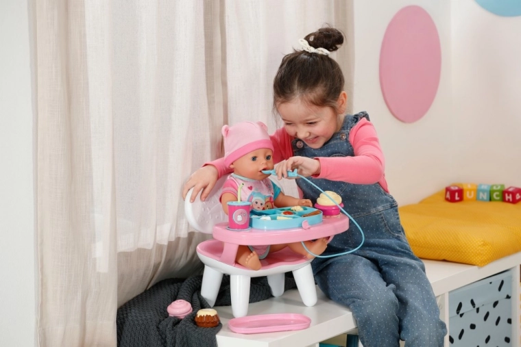 Der interaktive BABY born Hochstuhl verwandelt jede Mahlzeit in ein spielerisches Erlebnis. Leuchtet das grüne Licht, „isst“ die Puppe zufrieden; beim roten Licht zeigt sie lautstark ihren Unmut. So fördern Kinder Empathie, Feinmotorik und Fantasie bei realistischer Puppenpflege.