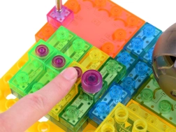 Einfaches Zusammenklicken leitfähiger Bausteine, übersichtliche Basis und deutlich gekennzeichnete Teile. Kinder sehen, wie die Schaltung Schritt für Schritt entsteht – von der Stromversorgung bis zum Lautsprecher.