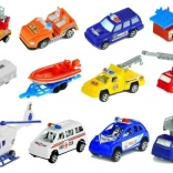 Enthalten sind ein Polizeiwagen, Rettungskräfte, ein Feuerwehrfahrzeug mit ausziehbarer Leiter, ein Bus, Arbeitsfahrzeuge sowie Anhänger mit Gepäck und einem Boot.