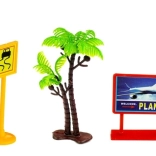 Blau-weißer Hubschrauber, Figuren der Crew und Passagiere, Schilder, Schranken, Palmen und weitere Elemente für authentische Flughafenatmosphäre.