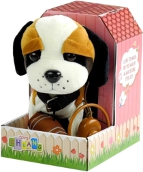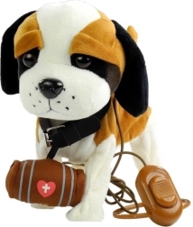 Der interaktive braun-weiße Bernhardiner an der Leine ist aus weichem und umweltfreundlichem Material gefertigt, das angenehm zu berühren ist. Er ist mit großen dunklen Augen, einem ausgeprägten Schwanz und einer markanten Nase ausgestattet. Das Spielzeug enthält eine lange Leine mit einem Schalter, durch den das Kind sein Haustier einfach steuern kann. Der Hund tanzt und singt, was das Spiel unterhaltsam und realistisch macht.