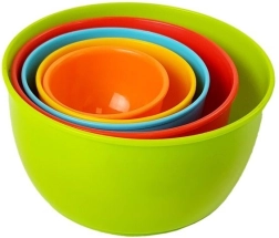 Schalen in leuchtenden Farben unterstützen die Farberkennung und sparen dank Ineinanderstecken Platz.
