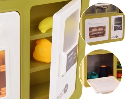 Diese Kinderküche imitiert eine echte Küche detailgetreu und motiviert Kinder zum Rollenspiel. Enthalten sind ein Spülbecken mit Wasserumlauf, ein Kochfeld mit Licht-, Sound- und Dampfeffekten, eine Dunstabzugshaube sowie eine Uhr mit beweglichen Zeigern. Aufklappbare Türen an Kühlschrank, Ofen und Geschirrspüler erhöhen die Realitätsnähe und fördern Ordnungssinn und Organisation.