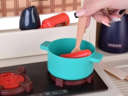 Das Kochfeld simuliert das Kochen: leuchtende Brenner, blubbernde Geräusche und feiner Dampf regen die Fantasie an und machen das Spiel noch realistischer.