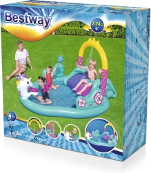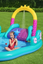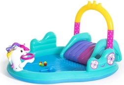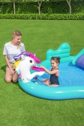 Dieser farbenfrohe aufblasbare Einhorn-Spielplatz macht heiße Tage zu unvergesslichen Wasserabenteuern. Einfach den Gartenschlauch am Bogen anschließen und es entsteht eine feine Wasserdusche, die Kinder angenehm abkühlt. Das geräumige Becken mit 220 Litern Volumen ist perfekt für kleine Wasserratten und dank der robusten PVC-Konstruktion bestens für ausgelassenes Spielen geeignet.