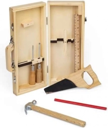 Säge, Hammer, Schraubendreher, Zimmermannsbleistift und Lineal – alles an Kinderhände angepasst für erste, sichere Heimwerker-Erfahrungen.