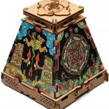Die Installation ist intuitiv: Überdecken Sie das ursprüngliche Bild mit einer schwarzen Schicht, befestigen Sie die Rahmen und setzen Sie nach und nach 4 Sets von Teilen zusammen – jeweils eines für eine Seite der Pyramide. Das Zusammenbauen beschäftigt Einzelspieler wie Gruppen von 1–4 Personen für 90–120 Minuten, und das Ergebnis ist eine langlebige Dekoration aus Holz.