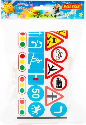 Bereite die Schilder vor, starte das Auto und mach dich auf den Weg! Lerne auf spielerische Weise, Verkehrszeichen mit diesem Kunststoffset zu erkennen!