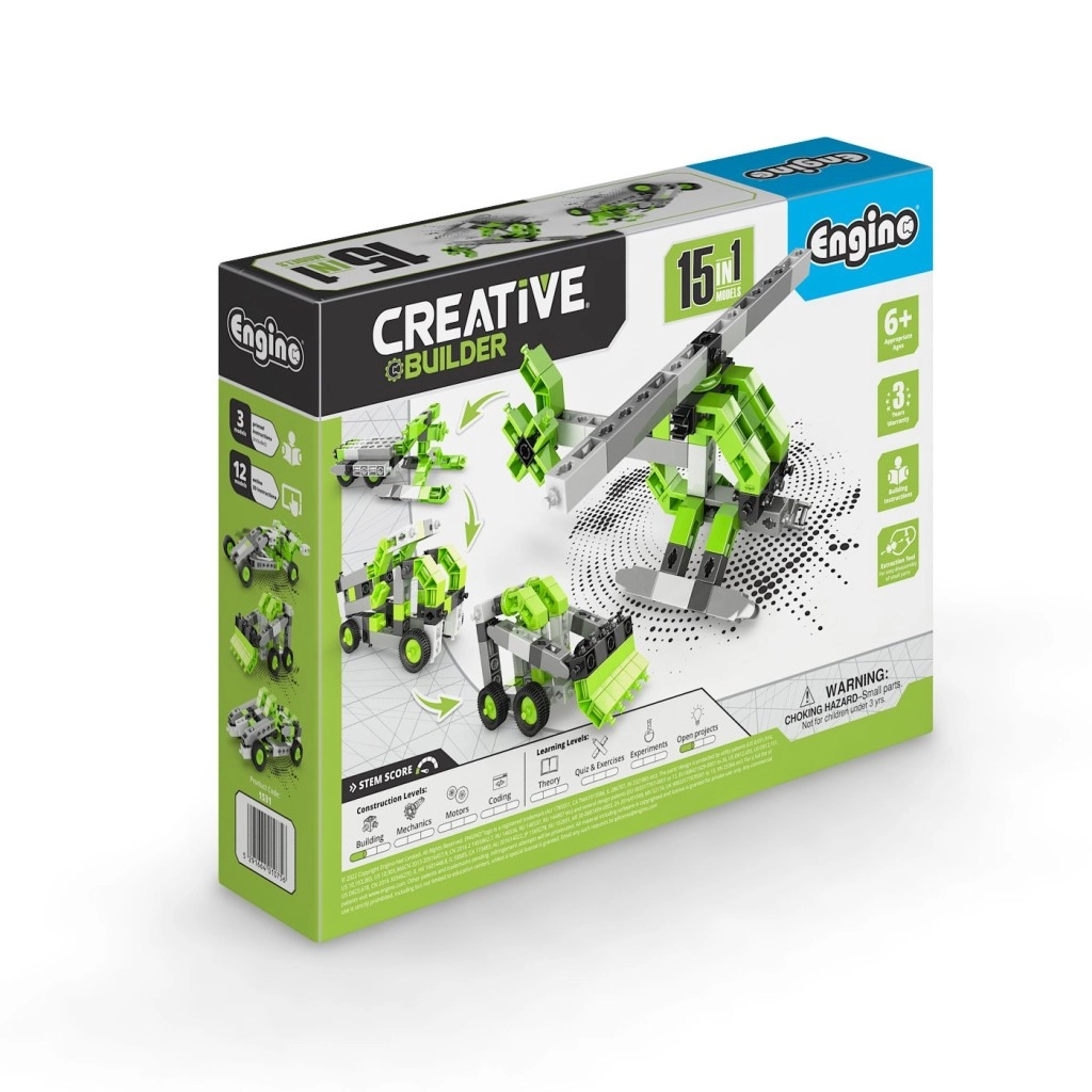 Das Bauset Engino Creative Builder 15 in 1 bietet Kindern stundenlangen Spiel- und Lernspaß. Dank des cleveren Verbindungssystems lässt sich ein Modell leicht in ein anderes umbauen, sodass verschiedene mechanische Prinzipien ausprobiert werden können. Die intuitive mobile App Engino kidCAD auf Deutsch zeigt Modelle in 3D, sodass sie gedreht, vergrößert und Schritt für Schritt aufgebaut werden können.