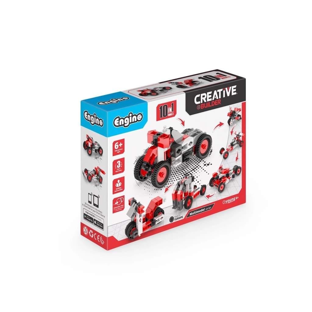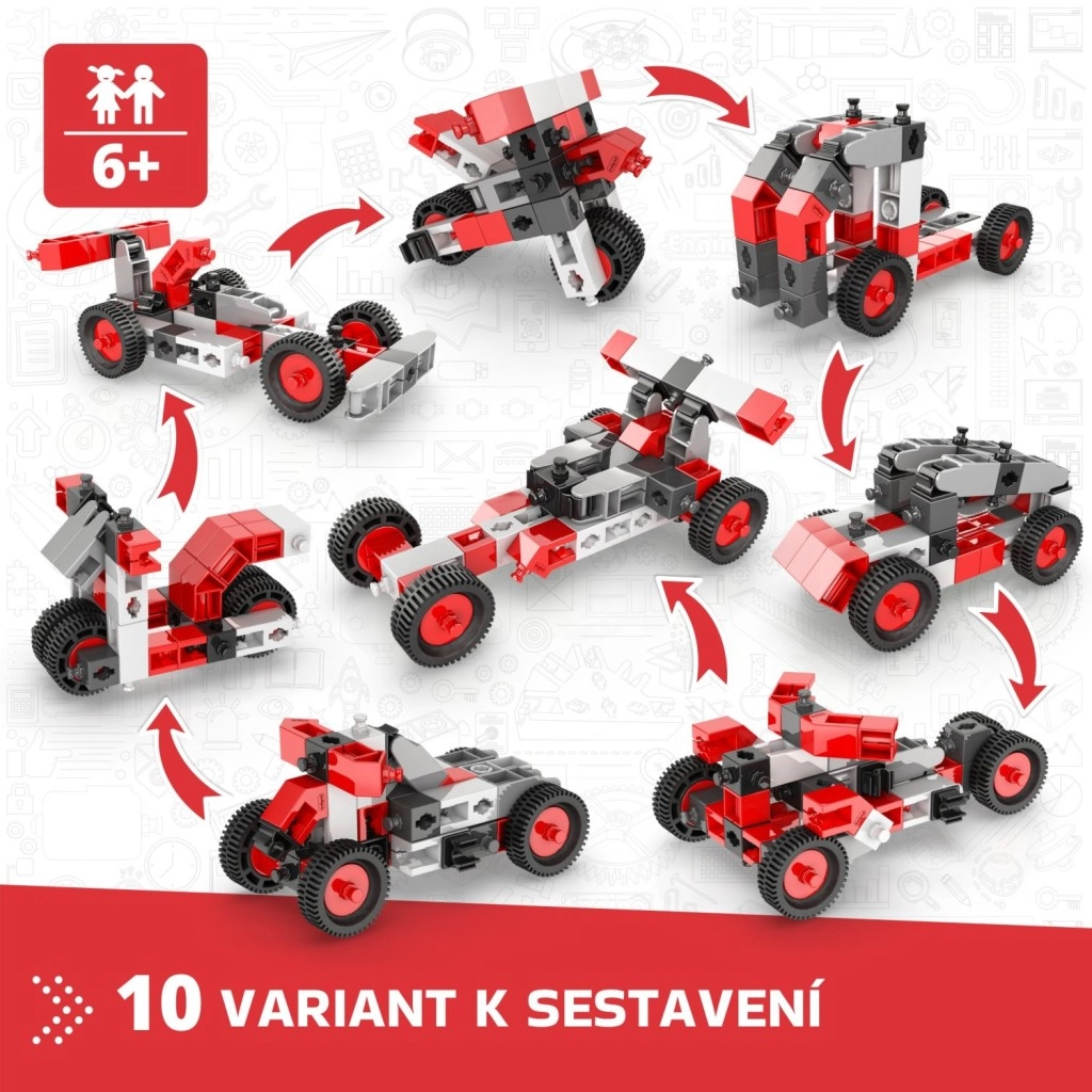 Dieses ENGINO Creative Builder Set verbindet Technik und Fantasie in einem. Aus stabilen Kunststoffteilen in Rot‑Weiß‑Grau entstehen Motorräder, Buggys oder kleine Autos, die dank des durchdachten Systems aus Rädern und Verbindern im Handumdrehen zu neuen Modellen umgebaut werden. Eine Box, 10 Modelle und endlose Spielstunden.