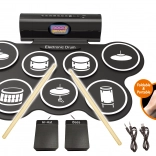 7 elektronische Trommeln, 2 Pedale, 2 Holzstöcke, Kabel zum Anschließen von Handy/MP3-Player, USB-Kabel, Anleitung