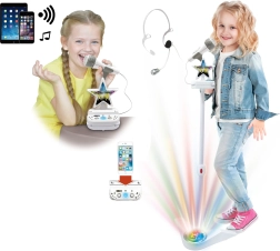 Mit diesem Bluetooth Karaoke-Set werden Sie viel Spaß haben. Es enthält ein Karaoke-Modul, einen Ständer mit Mikrofon und ein Kopfmikrofon, das für stabilen und komfortablen Gesang auch bei Bewegung sorgt. Das Bedienfeld ist mit einem Ständer für Mobilgeräte oder MP3-Player ausgestattet, sodass Sie mühelos Texte oder Videos verfolgen können.