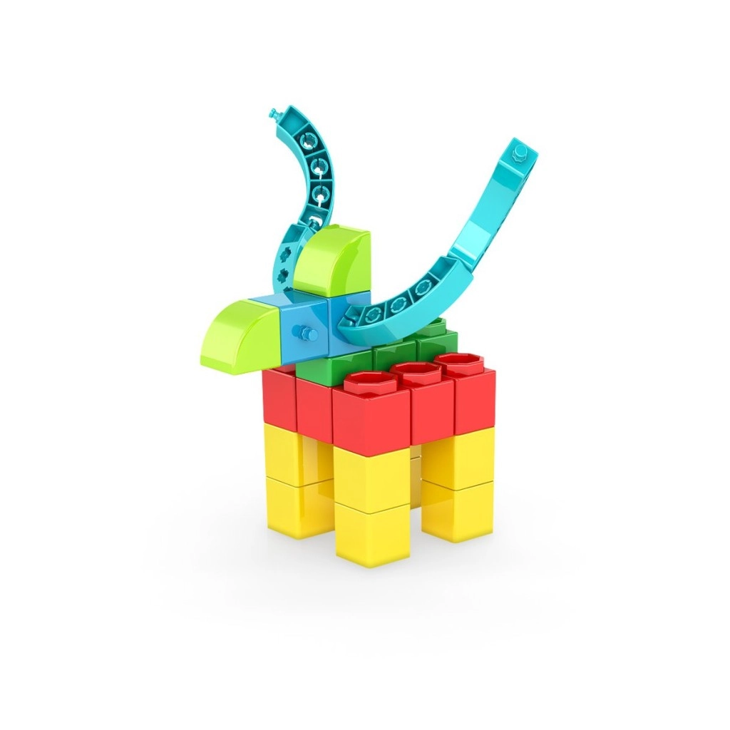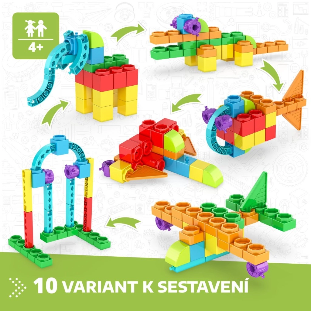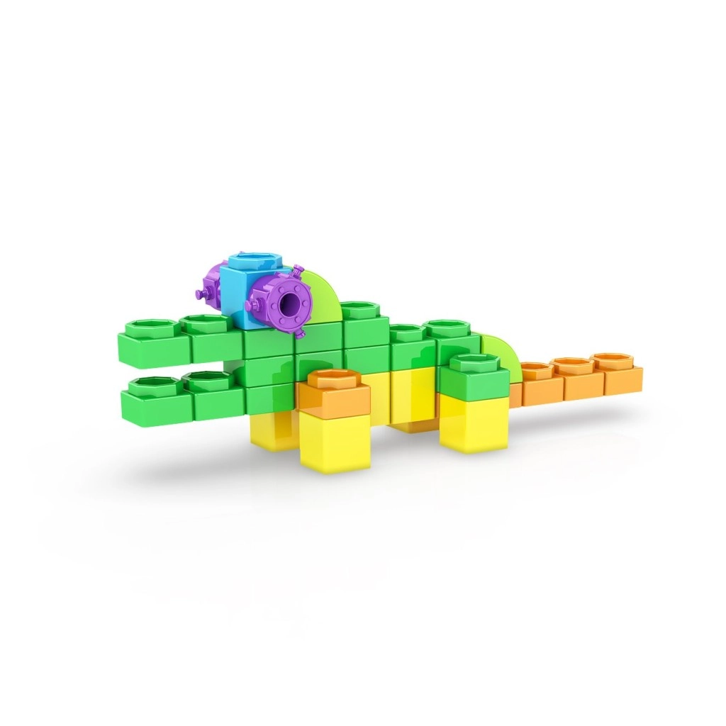 Bauen Sie Tiere, Maschinen und Fahrzeuge aus großen, farbenfrohen und leicht verbindbaren Teilen. Die Vielfalt fördert Vorstellungskraft und Feinmotorik.
