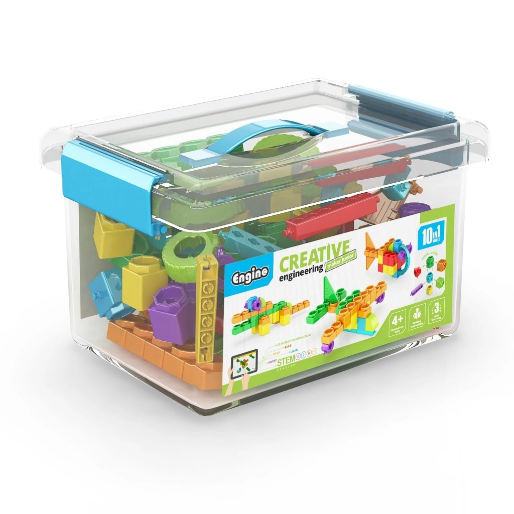 Die transparente Box mit Griff und Verschlüssen hält die Teile zusammen, sorgt für Ordnung und ermöglicht einfaches Mitnehmen überallhin.