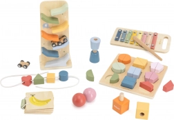Dieses sorgfältig zusammengestellte VIGA-Set für das Alter von 18–24 Monaten vereint beliebte Holzspielzeuge zu einem harmonischen Ganzen. Enthalten sind ein Xylofon für erste musikalische Experimente, eine unterhaltsame Autorabahn, ein Formenpuzzle, Gewindeteile, Fädelelemente und ein Holz-Bilderbüchlein mit Obstmotiven. Jedes Element ist so gestaltet, dass es die natürliche Entwicklung des Kindes durch Spiel fördert.